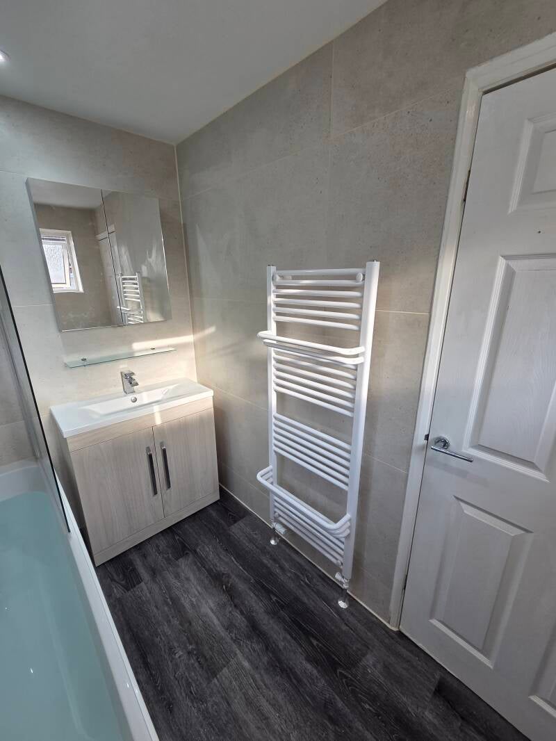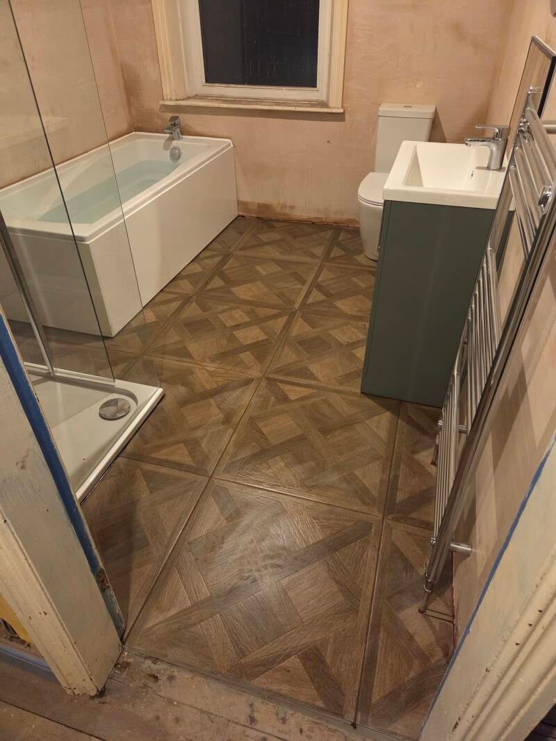 Lawrence Road, Huddersfield, 1st & 2nd fix. Fully tiled & suite installed & LVT Herringbone floor installed.